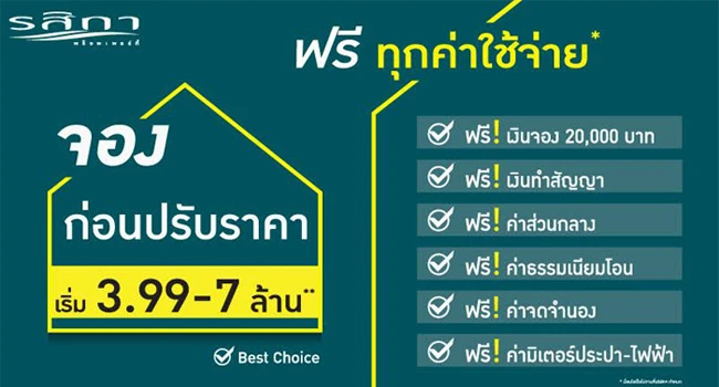 รสิกา พร็อพเพอร์ตี้ จัดเต็มโปรโมชั่น "จองก่อนปรับราคา" พร้อมโปรโมชั่นฟรี ทุกค่าใช้จ่าย