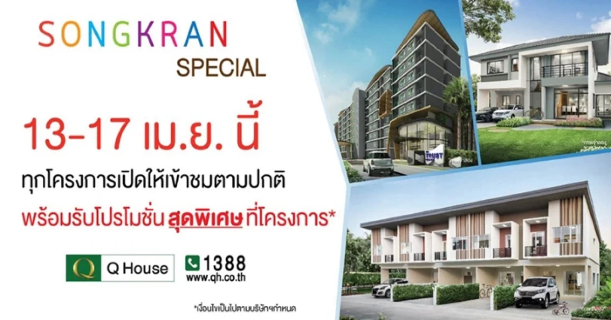 ทั้งนี้ เพื่อสนับสนุนให้ลูกค้าได้รับประโยชน์จากมาตรการดังกล่าว ซึ่งกำลังจะสิ้นสุดในวันที่ 28 เมษายน 2559 บริษัทฯ จึงได้เปิดการขายในช่วงวันหยุดสงกรานต์ 13-15 เมษายน 2559 รวมไปถึงวันเสาร์-อาทิตย์ที่ 16-17 นี้ด้วย ตั้งแต่เวลา 10.00-18.00 น. เพื่อให้ลูกค้าเข้าเยี่ยมชมและจองโครงการที่อยู่อาศัยในเครือควอลิตี้เฮ้าส์ที่สนใจ พร้อมทั้งยังมอบโปรโมชั่นสุดพิเศษ "สงกรานต์ สเปเชียล" รับส่วนลดสูงสุด 1,000,000 บาท พร้อมสิทธิพิเศษอื่นๆ อีกมากมาย (เงื่อนไขเป็นไปตามที่โครงการกำหนด)