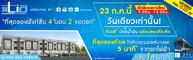บริษัท ลลิล พร็อพเพอร์ตี้ จำกัด (มหาชน) เปิดให้ลงทะเบียนทาวน์โฮมทำเลดีกับ "ไลโอ เพชรเกษม 81 (Lio Phetkasem 81)" 23 ก.ค.นี้ เปิดโครงการใหม่ 9.00 น. - 13.00 น. วันเดียวเท่านั้น *รับฟรี บัตรน้ำมัน พร้อมของที่ระลึก พบกับที่สุดของฟังก์ชั่น 4 นอน 2 จอดรถ ที่สุดของทำเลใกล้เดอะมอลล์บางแค 5 นาที จากรถไฟฟ้าสายสีน้ำเงิน ราคาเริ่ม 1 ล้านกว่า* ท่านที่สนใจสามารถลงทะเบียนเพื่อรับส่วนลด 20,000 บาทได้ที่เว็บไซต์ของโครงการ