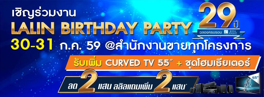 นายชูรัชฏ์ กล่าวว่า นอกจากนี้ในเดือนสิงหาคมนี้ ยังถือเป็นเดือนแห่งการครบรอบปีที่ 29 ของบริษัท ดังนั้น จึงจัดกิจกรรมเพื่อเฉลิมฉลองในวาระพิเศษดังกล่าว ด้วยแคมเปญใหญ่ "ลลิล เบิร์ธเดย์ปาร์ตี้ 29 ปี" เพื่อมอบให้แทนคำขอบคุณลูกค้าที่ให้การสนับสนุนและมอบความไว้วางใจบริษัทฯ ด้วยดีตลอดมา โดยสิทธิสุดพิเศษที่มอบให้แก่ลูกค้าที่จองในช่วงเดือนสิงหาคม จะได้รับส่วนลดทันที 2 แสน ลลิลแถมเพิ่ม 2 แสน และหากจองภายในวันที่ 30-31 กรกฎาคม 2559 นี้ จะได้รับสิทธิพิเศษ CURVED TV 55 นิ้ว + ชุดโฮมเธียเตอร์ อีกทันที