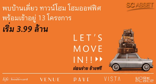 บริษัท เอสซี แอสเสท คอร์ปอเรชั่น จำกัด (มหาชน) จัดโปรโมชั่นพิเศษ "Let's Move In!! ผ่อนง่าย ย้ายฟรี" พบข้อเสนอพิเศษ มูลค่าสูงสุด 1,000,000 บาท* ยกขบวน บ้านเดี่ยว ทาวน์โฮม และโฮมออฟฟิศ พร้อมเข้าอยู่ 13 โครงการ บนทำเลศักยภาพใกล้รถไฟฟ้า และทางด่วนฯ มาเข้าร่วมโปรโมชั่น "ผ่อนง่าย" เพียงล้านละ 2,999 บาท/เดือน นาน 2 ปี* "ย้ายฟรี" ฟรี บริการขนย้ายบ้าน ราคาเริ่มต้นตั้งแต่ 3.99 ล้านบาท ภายในเดือนสิงหาคมนี้