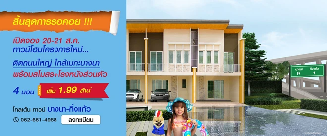 เปิดให้จองทาวน์โฮมโครงการใหม่ 20-21 ส.ค. นี้ ทำเลบางนา - กิ่งแก้ว พบกับทาวน์โฮม 4 ห้องนอน 3 ห้องน้ำ ติดถนนใหญ่ ใกล้ทางด่วน และเมกะบางนา พร้อมสโมสร + โรงหนังส่วนตัว เริ่ม 1.99 ล้านบาท*