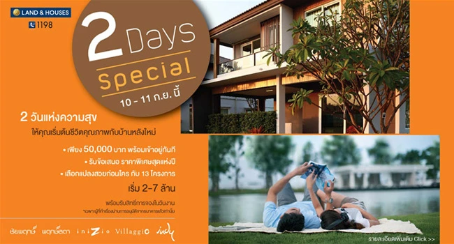 บริษัท แลนด์ แอนด์ เฮ้าส์ จำกัด (มหาชน) จัดแคมเปญสุดพิเศษเอาใจคนรักบ้านแลนด์ "2 Days Special" 2 วันแห่งความสุข ให้คุณเริ่มต้นชีวิตคุณภาพกับบ้านหลังใหม่ พบกับบ้านเดี่ยวและทาวน์โฮมกับ 13 โครงการ เพียง 2 วัน เท่านั้น พบกันวันที่ 10 - 11 กันยายน 2559 นี้ กับโปรโมชั่นสุดพิเศษ ดังนี้