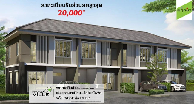 บริษัท พฤกษา เรียลเอสเตท จำกัด (มหาชน) เปิดจองบ้านโครงการใหม่ "พฤกษาวิลล์ 90 รังสิต - คลองเปรม" ทาวน์เฮ้าส์ สไตล์โมเดิร์น แบบบ้านใหม่ ทำเลดี ใกล้แนวรถไฟฟ้าสายสีแดง โทลล์เวย์ และทางด่วน เพียง 10 นาที ถึงฟิวเจอร์พาร์ค รังสิต จองวันงานฟรีแอร์* สิทธิพิเศษ! ลงทะเบียนออนไลน์รับส่วนลดสูงสุด 20,000 บาท* วันที่ 24 - 25 กันยายน 2559 นี้