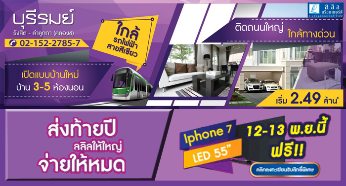 บริษัท ลลิล พร็อพเพอร์ตี้ จำกัด (มหาชน) เปิดแบบบ้านเดี่ยวรูปลักษณ์ใหม่ กับโครงการ "บ้านบุรีรมย์ รังสิต - ลำลูกกา (คลอง4) (Baanburirom Rangsit - klong 4)" เตรียมพบกับโปรโมชั่นส่งท้ายปี ลลิลให้ใหญ่ จ่ายให้หมด บ้านเดี่ยว ติดถนนใหญ่ ใกล้รถไฟฟ้า เพียง 5 นาทีถึงทางด่วน กับบ้านฟังก์ชั่นที่ปรับได้ตามใจคุณ พร้อมรูปลักษณ์ใหม่บนทำเลที่คุณคุ้นเคย ฟรี iPhone 7, LED 55", แอร์ทั้งหลัง ในวันที่ 12-13 พฤศจิกายน 2559 นี้ ท่านที่สนใจสามารถคลิกลงทะเบียนเพื่อรับสิทธิพิเศษได้ที่เว็บไซต์ของลลิล พร็อพเพอร์ตี้