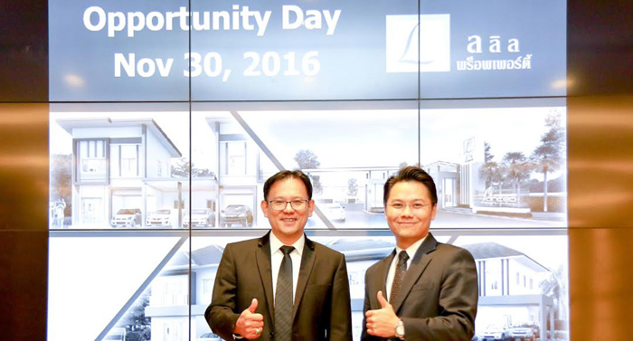 นายกร ธนพิพัฒนศิริ (ซ้าย) ผู้ช่วยกรรมการผู้จัดการสายงานการเงินและบริหาร และ นายเสรี สินธุอัสว์ (ขวา) ผู้อำนวยการฝ่ายการเงินและเลขานุการ บริษัท ลลิล พร็อพเพอร์ตี้ จำกัด (มหาชน) (LALIN) ผู้พัฒนาโครงการอสังหาริมทรัพย์ภายใต้คอนเซปต์ "บ้านที่ปลูกบนความตั้งใจที่ดี" ให้ข้อมูลผลการดำเนินงานประจำไตรมาสที่ 3/2559 และรอบระยะเวลา 9 เดือน ปี 2559 ในกิจกรรมบริษัทจดทะเบียนพบนักลงทุน (Opportunity Day) เปิดเผยรายได้รอบไตรมาส 3/2559 ที่เติบโตอย่างต่อเนื่องติดต่อกันเป็นไตรมาสที่สี่ มียอดรับรู้รายได้ที่ 747.2 ล้านบาท เพิ่มขึ้นจากช่วงเดียวกันของปีก่อน 48% มีกำไรสุทธิอยู่ที่ 142.3 ล้านบาท เพิ่มขึ้น 78% ขณะที่รอบ 9 เดือน รับรู้รายได้กว่า 2,050 ล้านบาท เพิ่มขึ้น 57.5% และกำไรสุทธิอยู่ที่ 385.3 ล้านบาท เติบโตขึ้น 100.4% เตรียมเปิดโครงการใหม่ ลำดับที่ 9 ช่วงต้นเดือนธันวาคมนี้ ณ ห้องประชุม 603 ชั้น 6 อาคารตลาดหลักทรัพย์แห่งประเทศไทย ถนนรัชดา เมื่อเร็วๆ นี้