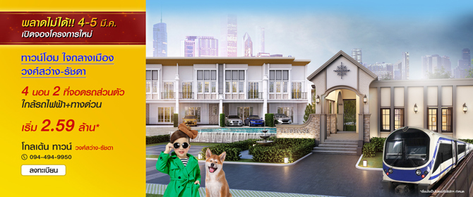 โกลเด้น แลนด์ เปิดจองทาวน์โฮมโครงการใหม่ "โกลเด้น ทาวน์ วงศ์สว่าง - รัชดา (Golden Town Wongsawang - Ratchada)" 4-5 มี.ค. นี้ ทาวน์โฮมใจกลางกรุง!! ทำเลทอง ใกล้รถไฟฟ้า+ทางด่วน 4 ห้องนอน 2 ที่จอดรถส่วนตัว พร้อมสโมสรและโรงหนังส่วนตัว เริ่มต้นเพียง 2.59 ล้าน* คุ้มเว่อร์!!!! สำหรับท่านที่สนใจสามารถลงทะเบียนเพื่อรับส่วนลดเพิ่ม สูงสุด 10,000 บาท ได้ที่ทางเว็บไซต์ของโกลเด้น แลนด์