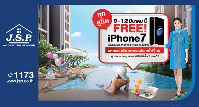 นายธีระชาติ มโนธรรมรักษา รองกรรมการผู้จัดการ บริษัท เจ.เอส.พี.พร็อพเพอร์ตี้ จำกัด (มหาชน) หรือ JSP เปิดเผยว่า บริษัทฯ เตรียมนำโครงการที่อยู่อาศัยมาตรฐานคุณภาพ 20 โครงการ ทั้งในเครือเจ.เอส.พี.พร็อพเพอร์ตี้ และเจ.เอส.พี. แอสพลัส ร่วมออกบูธงานมหกรรมบ้านและคอนโดฯ ครั้งที่ 36 ด้วยแคมเปญสุดพิเศษ เพียงจองภายในงาน รับส่วนลดสูงสุดถึง 800,000 บาท พร้อมแจกฟรี iPhone 7 (รับหลังวันโอนไม่เกิน 45 วัน)