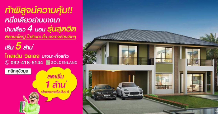 โกลเด้น แลนด์ ท้าพิสูจน์ความคุ้ม!! เฉพาะเดือน มีนาคม หนึ่งเดียวย่านบางนา กม. 11 กับโครงการ โกลเด้น วิลเลจ บางนา - กิ่งแก้ว (โกลเด้น วิลเลจ บางนา - กิ่งแก้ว) ลดเพิ่มทันที 1 ล้าน*!! เมื่อจองภายในเดือนมีนาคมนี้เท่านั้น บ้านเดี่ยว 4 นอน รุ่นสุดฮิต บนทำเลศักยภาพ ติดถนนใหญ่ ใกล้เมกะ และจุดขึ้น-ลงทางด่วนได้ง่ายๆ