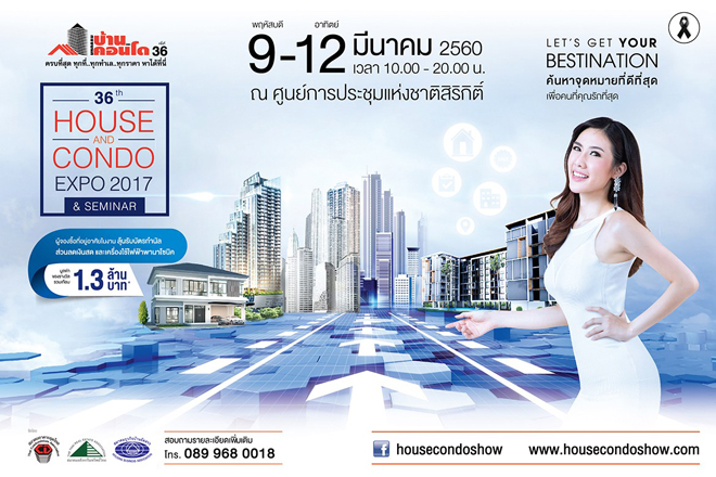 งานมหกรรมบ้านและคอนโด ครั้งที่ 36 จะจัดขึ้นระหว่างวันที่ 9-12 มีนาคม 2560 ณ ศูนย์การประชุมแห่งชาติ สิริกิติ์ บริเวณโซนซี ชั้น 1-2 และโซนพลาซ่า