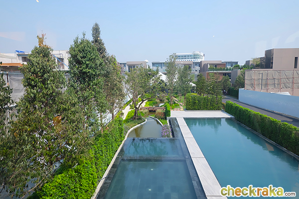 วิวสระว่ายน้ำและสวน เมื่อมองจากห้องออกกำลังกาย