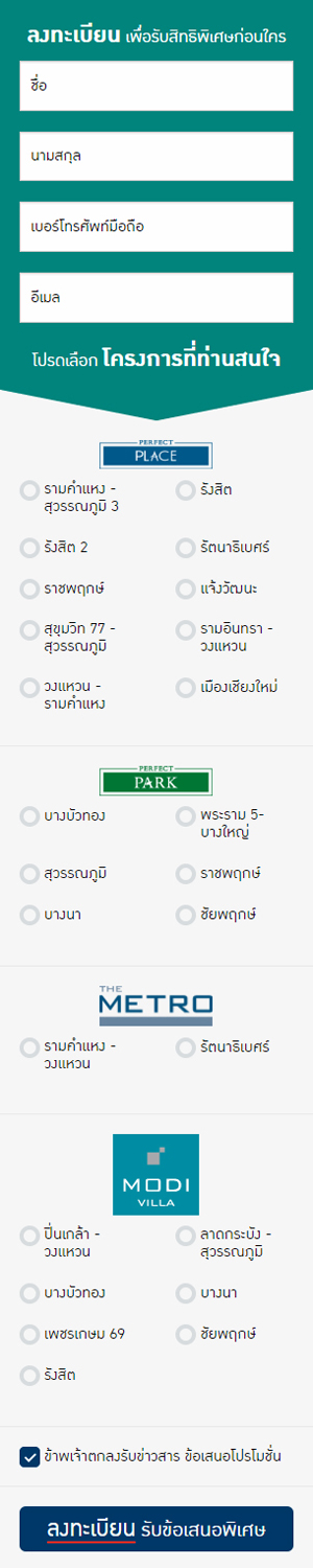 - เพอร์เฟค เพลส รังสิต (Perfect Place) คอนเซปต์ Lake Resort ด้วยทะเลสาบขนาดใหญ่กว่า 100 ไร่ เริ่ม 5.79 ล้านบาท