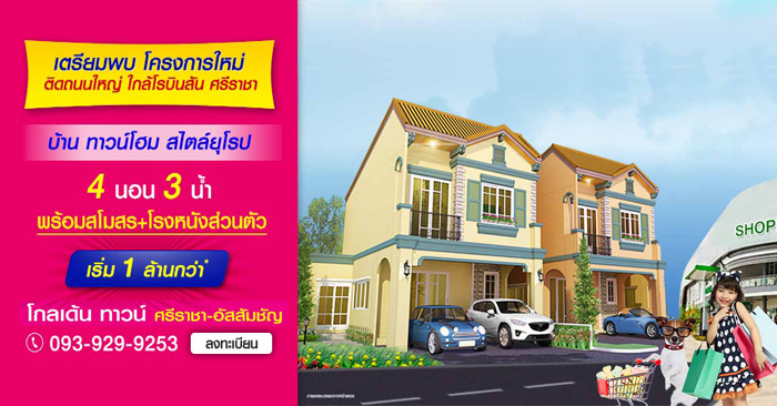 "โกลเด้น ทาวน์ ศรีราชา (Golden Town Sriracha)" เปิดให้จองแล้ว พบกับบ้าน ทาวน์โฮมสไตล์ยุโรป โครงการใหม่ ติดถนนใหญ่ ใกล้โรบินสัน ศรีราชา ภายในโครงการโปร่งสบายบรรยากาศดี มีคลับเฮ้าส์อลังการ แบบบ้านหรูหราสไตล์ยุโรปมีให้เลือกหลายแบบ ขนาด 4 ห้องนอน 3 ห้องน้ำ จำนวนทั้งสิ้น 476 แปลง พร้อม สโมสร + โรงหนังส่วนตัว ในทำเลศักยภาพ ใกล้แหล่งช้อปปิ้ง เดินทางได้สะดวก