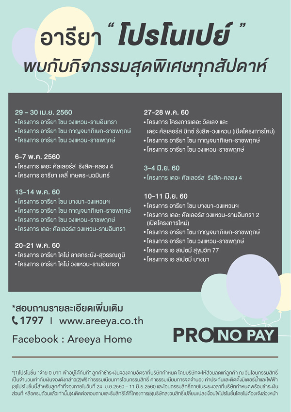 บริษัท อารียา พรอพเพอร์ตี้ จำกัด (มหาชน) ปลุกตลาดอสังหาฯ ระเบิดแคมเปญ "PRO NO PAY" เดินตัวปลิว ชิลล์เข้าบ้านจ่าย 0 บาท เข้าอยู่ได้ทันที ทั้งบ้านเดี่ยว วิลเลจทาวน์ ทาวน์โฮม และคอนโดทุกทำเลใจกลางเมือง หนุนคนไทยมีบ้านง่ายขึ้น ในสังคมคุณภาพ ระหว่างวันที่ 24 เม.ย. 2560 - 11 มิ.ย. 2560 เริ่ม 1.45 - 12.9 ล้านบาท พร้อมรับฟรีค่าธรรมเนียมการโอนกรรมสิทธิ์