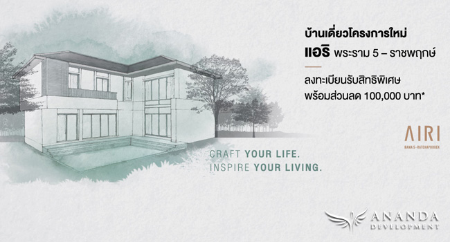 บริษัท อนันดา ดีเวลลอปเม้นท์ จํากัด (มหาชน) เตรียมเปิดตัวบ้านเดี่ยวแบรนด์ใหม่ "แอริ พระราม 5 - ราชพฤกษ์ (Airi Rama 5 - Ratchaphruek)" มาพร้อมคอนเซ็ปต์ Craft your life inspire your living โดยเปิดให้ผู้ที่สนใจเข้าลงทะเบียนผ่านเว็บไซต์ เพื่อรับส่วนลดถึง 100,000 บาท* เตรียมพร้อมเปิดตัวเร็วๆ นี้