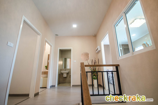 ประตูบานเลื่อนกระจกด้านหลังบานใหญ่ ทำให้พื้นที่ด้านหลังบ้านดูโปร่งและสว่างมากขึ้น ระดับจากพื้นสูงถึงเพดานถึง 2.8 เมตร ทำให้รู้สึกถึงความโล่งปร่งสบาย ซึ่งบริเวณพื้นที่ด้านหลังบ้านและโรงรถ เราได้ตอกเสาเข็มขนาดเท่ากับตัวบ้าน จึงหมดปัญหาเรื่องการทรุดตัว รองรับให้กับทุกความต้องการในระยะยาว อาทิเช่น ห้องซักรีด, ครัวไทย, หรือพื้นที่ส่วนพักผ่อน ซึ่งถือเป็นสิ่งที่พิเศษสุดที่โครงการมอบให้กับลูกค้า