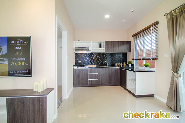 ชั้นล่างเป็นพื้นที่รับแขก และโซนรับประทานอาหาร และพิเศษกับห้องนอนชั้นล่างที่ออกแบบมาเพื่อผู้สูงอายุ ที่สะดวกและปลอดภัย ไม่ต้องเดินขึ้นลงบันได พร้อมเฟอร์นิเจอร์ ชุดรับแขก และชุดครัว