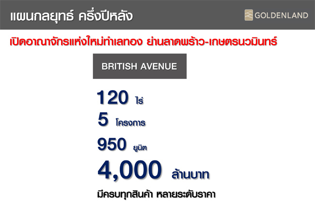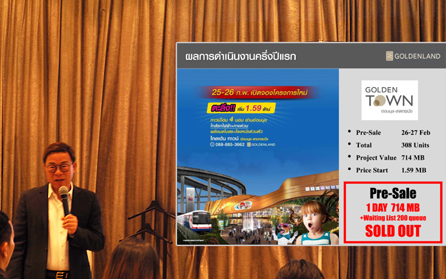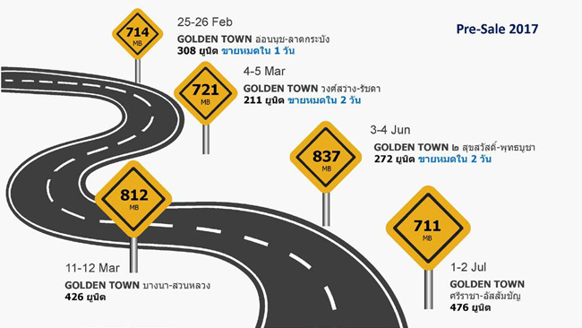 ยอดขาย 5 โครงการใหม่ มีดังนี้ โกลเด้น ทาวน์ อ่อนนุช-ลาดกระบัง 714 ล้านบาท ขายหมดในวันแรก โกลเด้น ทาวน์ วงศ์สว่าง-รัชดา 721 ล้านบาท ขายหมดใน 2 วัน โกลเด้น ทาวน์ บางนา-สวนหลวง 812 ล้านบาท ขายหมดเฟสแรก ใน 2 วัน โกลเด้น ทาวน์ ๒ สุขสวัสดิ์-พุทธบูชา 837 ล้านบาท ขายหมดใน 2 วัน และ โกลเด้น ทาวน์ ศรีราชา-อัสสัมชัญ 711 ล้านบาท