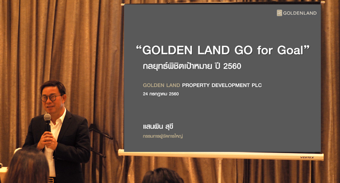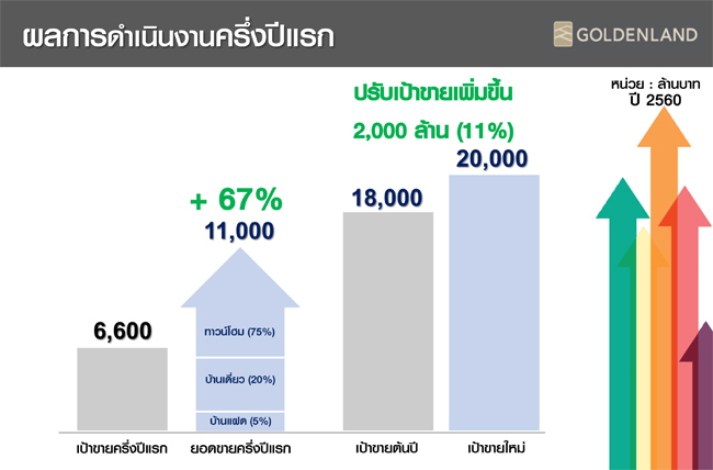 คุณปิง หรือ คุณแสนผิน สุขี กรรมการผู้จัดการใหญ่ บริษัท แผ่นดินทอง พร็อพเพอร์ตี้ ดีเวลลอปเม้นท์ จำกัด (มหาชน) หรือ โกลเด้นแลนด์ เปิดเผยผลการดำเนินงานในครึ่งปีแรกว่า บริษัทมียอดขายแล้ว 11,000 ล้านบาท จากเป้าหมายที่ตั้งไว้ 6,600 ล้านบาท หรือสูงกว่าเป้าหมาย 67% ทั้งนี้มีผลมาจาก การเปิด 5 โครงการใหม่ ที่มียอดขายเกินเป้าหมาย