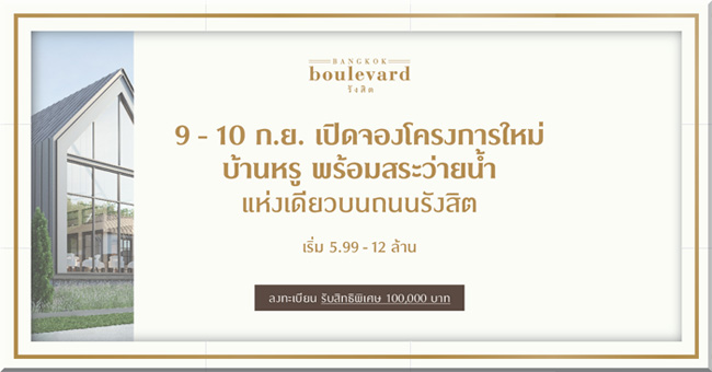 บริษัท เอสซี แอสเสท คอร์ปอเรชั่น จำกัด (มหาชน) เปิดให้จองบ้านใหม่ โครงการ "บางกอก บูเลอวาร์ด รังสิต (Bangkok boulevard Rangsit)" บ้านหรู พร้อมสระว่ายน้ำ แห่งเดียวบนถนนรังสิต เปิดให้ลงทะเบียนผ่านเว็บไซต์ เพื่อรับสิทธิพิเศษถึง 100,000 บาท ผู้ที่สนใจสามารถลงทะเบียนได้ที่ลิงก์ด้านล่างนี้ค่ะ