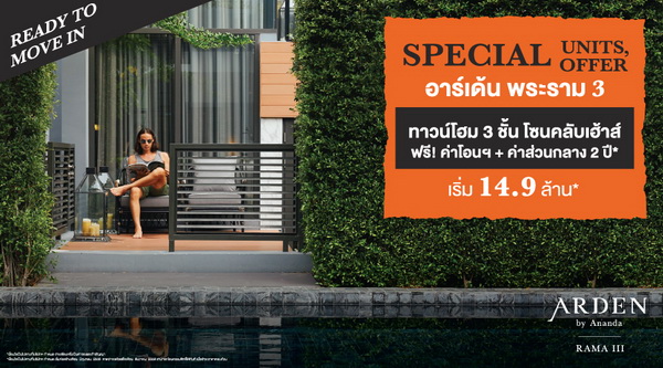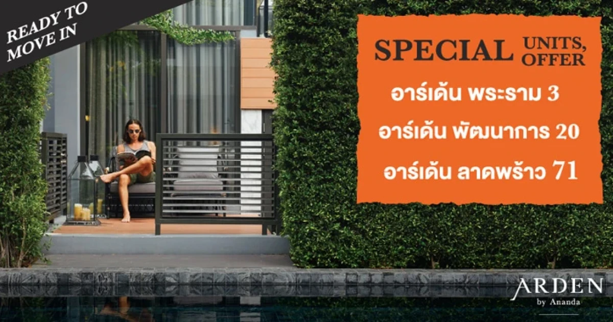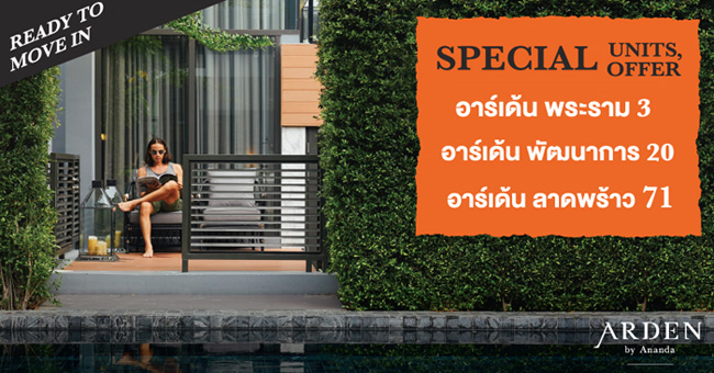 บริษัท อนันดา ดีเวลลอปเม้นท์ จํากัด (มหาชน) จัดโปรโมชั่นสุดพิเศษ บ้านแบรนด์ "อาร์เด้น (Arden)" ทาวน์โฮมพร้อมอยู่ ทั้ง 3 ทำเล อาร์เด้น พระราม 3, อาร์เด้น พัฒนาการ, และ อาร์เด้น ลาดพร้าว 71 เปิดให้ลงทะเบียนรับสิทธิพิเศษ รายละเอียดโปรโมชั่นของแต่ละโครงการมีดังต่อไปนี้ค่ะ