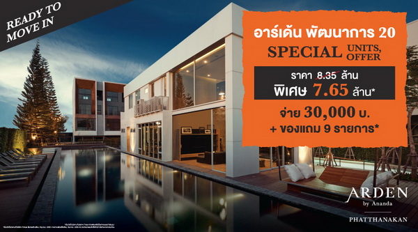 อาร์เด้น พัฒนาการ SPECIAL UNITS OFFER ราคา 8.35 ล้าน พิเศษ 7.65 ล้าน* จ่าย 30,000 บาท + ของแถม 9 รายการ* ลงทะเบียนรับสิทธิพิเศษจากโครงการอาร์เด้น พัฒนาการ 20 ที่ลิงก์ด้านล่าง