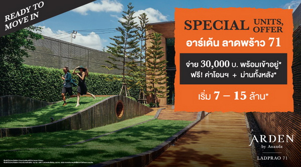 อาร์เด้น ลาดพร้าว 71 SPECIAL UNITS OFFER จ่าย 30,000 บาท พร้อมเข้าอยู่* ฟรี! ค่าโอนฯ + ม่านทั้งหลัง* เริ่ม 7-15 ล้าน* ลงทะเบียนรับสิทธิพิเศษจากโครงการอาร์เด้น ลาดพร้าว 71 ที่ลิงก์ด้านล่าง