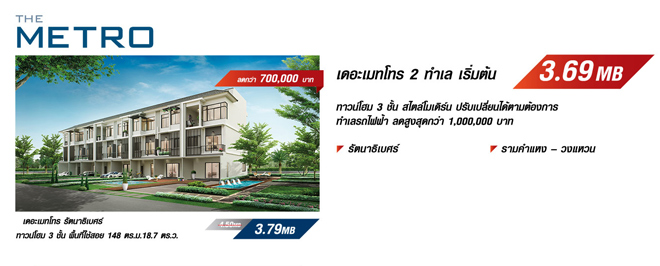เดอะ เมทโทร 2 ทำเล ทาวน์โฮม 3 ชั้น สไตล์โมเดิร์น ปรับเปลี่ยนได้ตามต้องการ ทำเลรถไฟฟ้า ลดสูงสุดกว่า 1,000,000 บาท เริ่มต้น 3.69 ล้านบาท