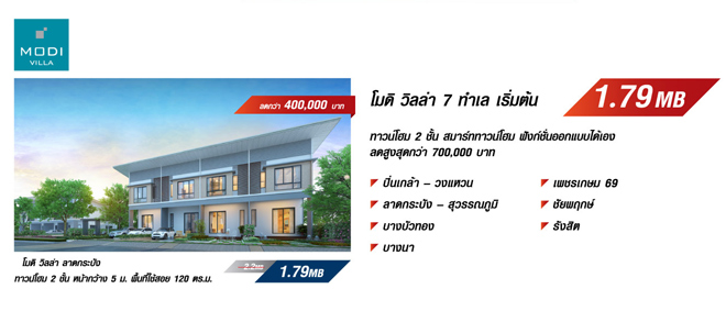 10 นาทีถึงรถไฟฟ้าสายสีม่วง เริ่ม 2.19 ล้านบาท - โมดิ วิลล่า ลาดกระบัง-สุวรรณภูมิ (Modi Villa)