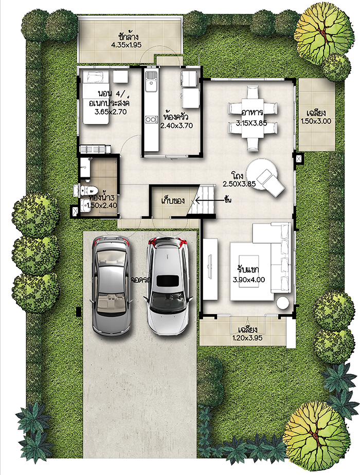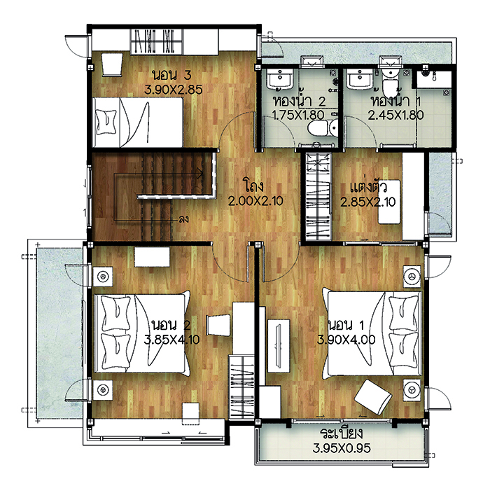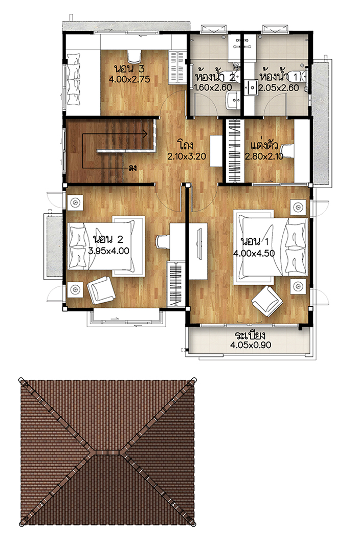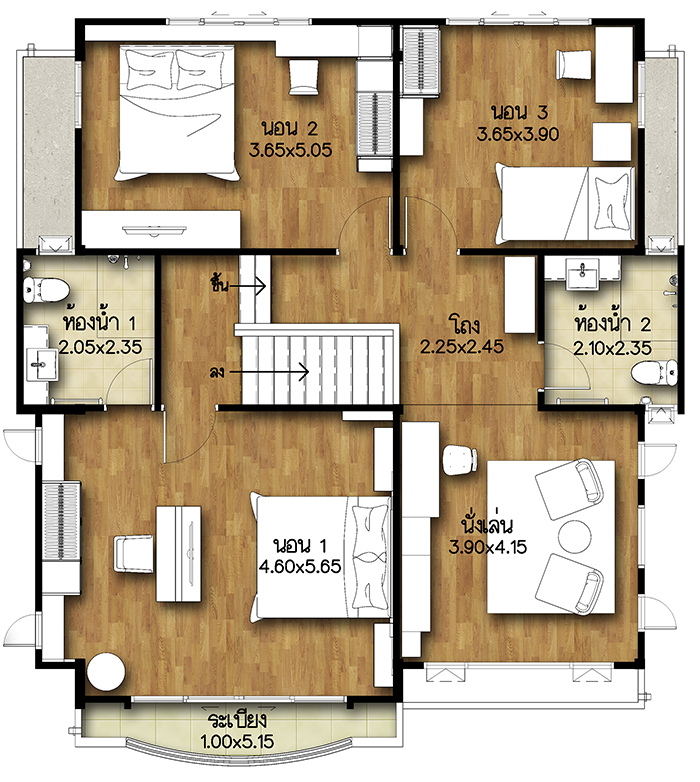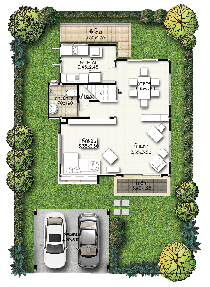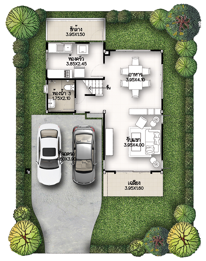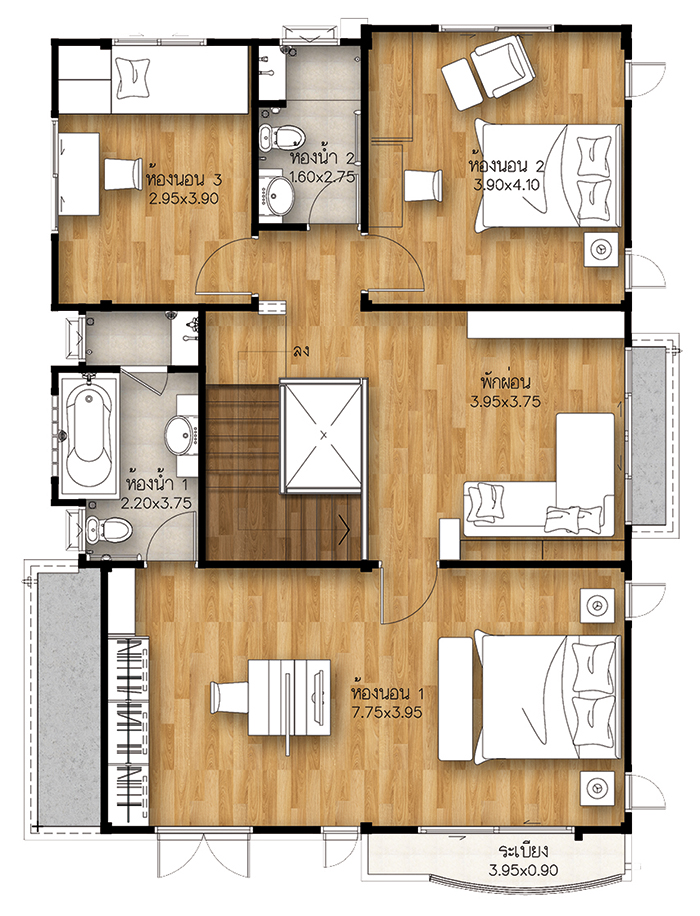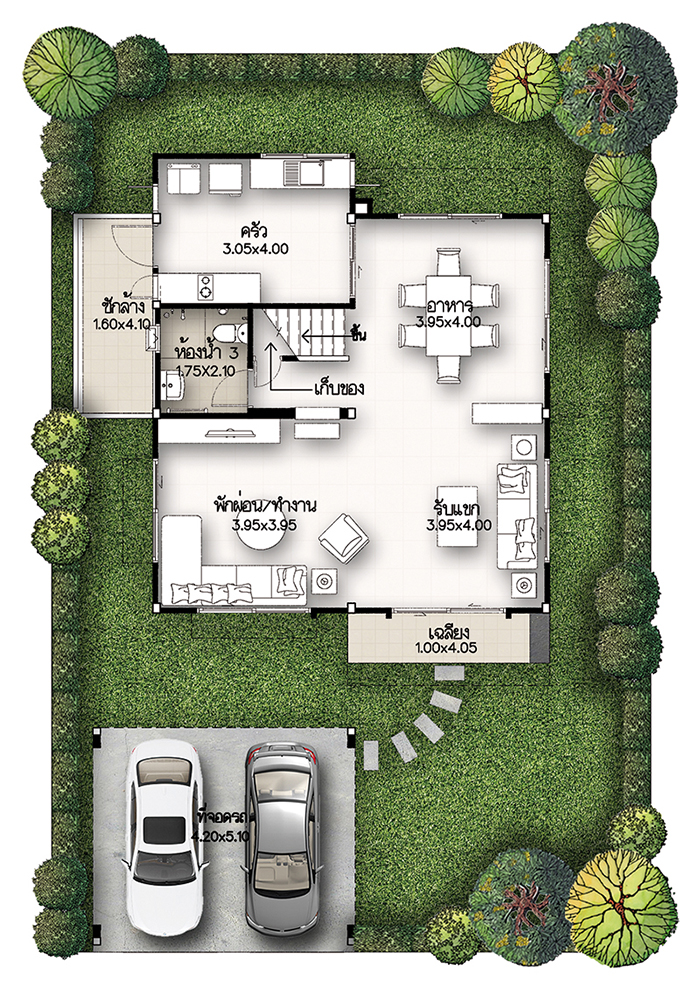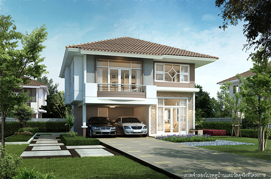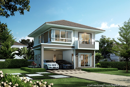 5. แบบบ้านศุภกฤต - บ้านเดี่ยว 2 ชั้น พื้นที่ใช้สอย 213 ตร.ม. สร้างบนที่ดินตั้งแต่ 59 ตร.ว. ขึ้นไป ขนาด 4 ห้องนอน 3 ห้องน้ำ 1 ห้องนั่งเล่น ที่จอดรถ 2 คัน