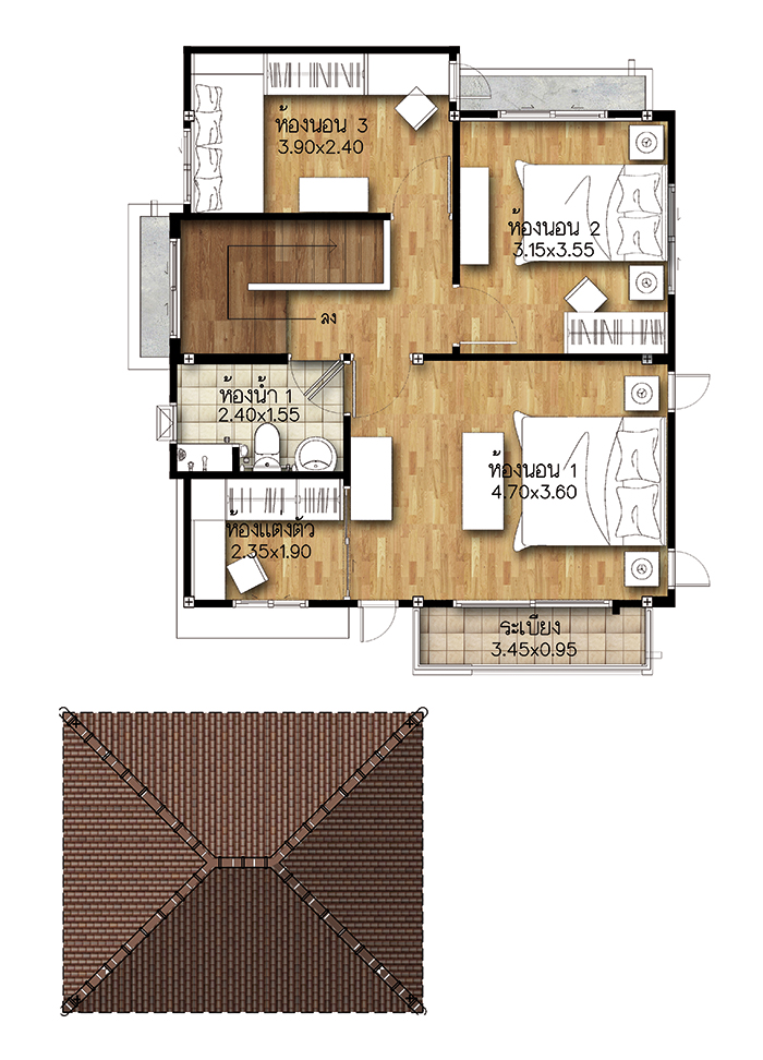 3. แบบบ้านศุภวัฒนา - บ้านเดี่ยว 2 ชั้น พื้นที่ใช้สอย 171 ตร.ม. สร้างบนที่ดินตั้งแต่ 54 ตร.ว. ขึ้นไป ขนาด 3 ห้องนอน 3 ห้องน้ำ 1 บริเวณทำงาน/พักผ่อน และที่จอดรถ 2 คัน