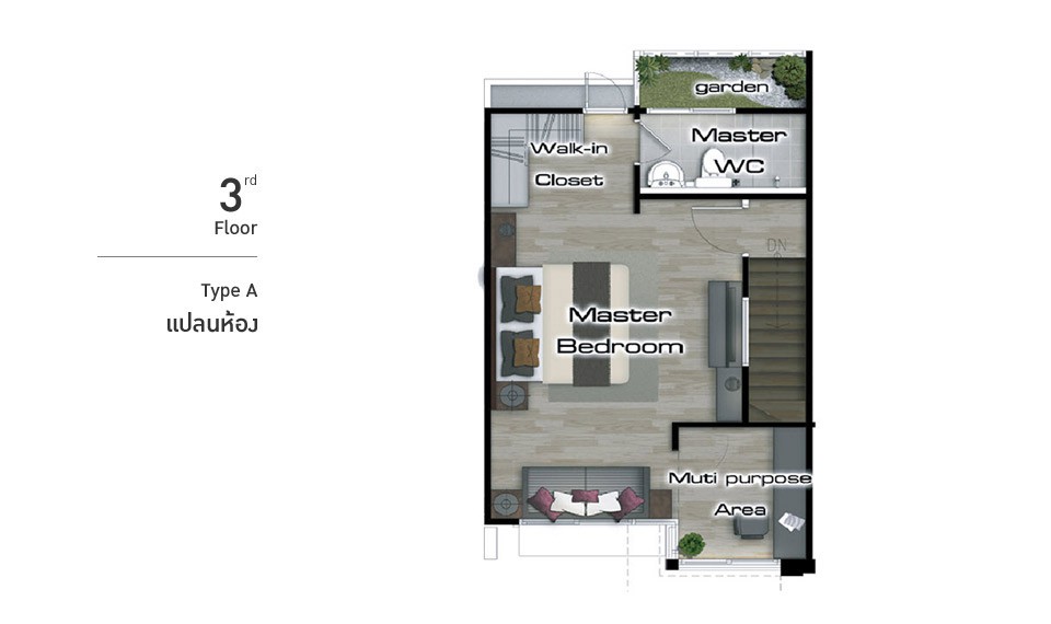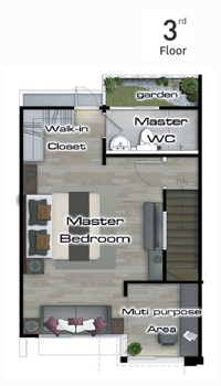 เหนือใครด้วย Penthouse Style Master Bedroom พร้อม Walk-In Closet และ Garden Bathroom ครบครันด้วยครัวไทยแยกส่วนมาตรฐานระดับบ้านเดี่ยว ปรับเปลี่ยนพื้นที่ใช้สอยในสไตล์คุณด้วย Multi Purpose Area ที่ชั้น 3