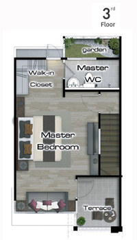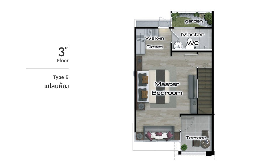 เหนือใครด้วย Penthouse Style Master Bedroom พร้อม Walk-In Closet และ Garden Bathroom ครบครันด้วยครัวไทยแยกส่วนมาตรฐานระดับบ้านเดี่ยว เต็มอิ่มกับบรรยากาศวิวรอบบ้านได้ที่ Terrace ส่วนตัว ที่ชั้น 3