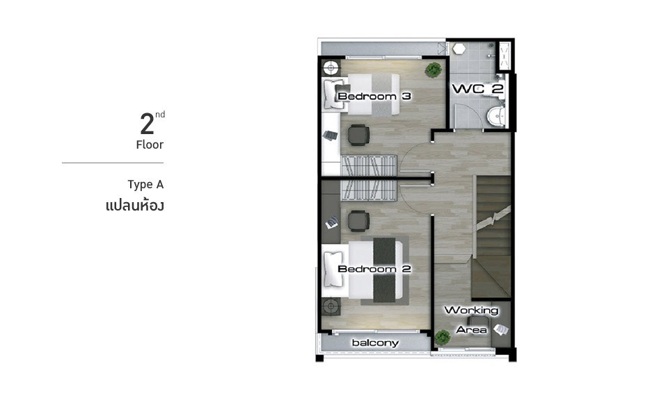 1. TYPE A - ทาวน์โฮม 3 ชั้น พื้นที่ใช้สอย 148 ตร.ม. 3 ห้องนอน, 3 ห้องน้ำ, 1 ห้องพักผ่อน, 1 ห้องครัว, 1 พื้นที่อเนกประสงค์ พร้อมที่จอดรถ 2 คัน