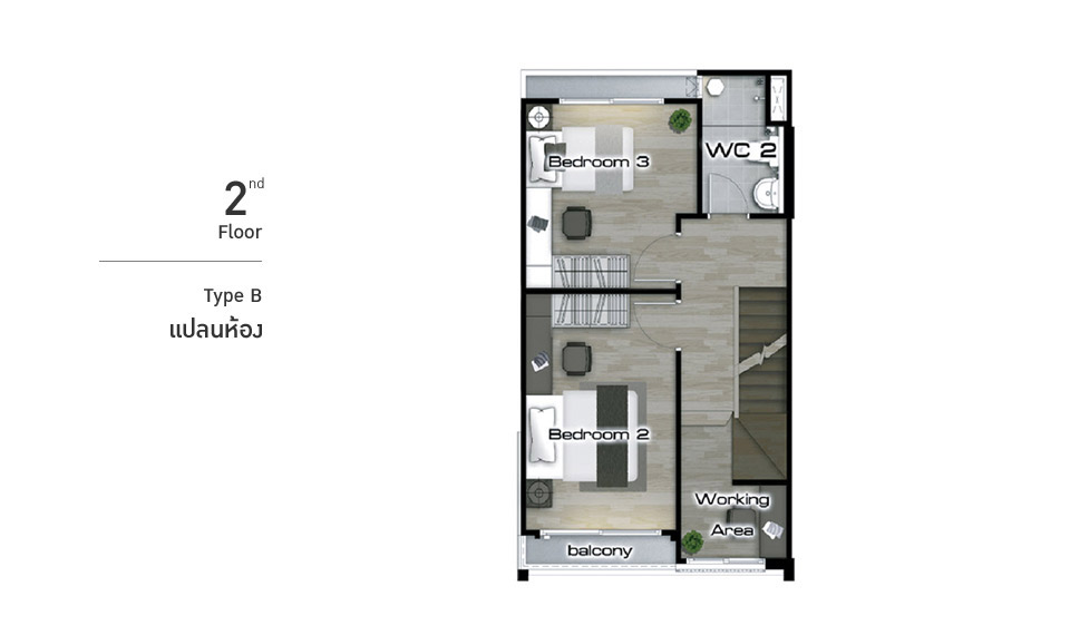 2. TYPE B - ทาวน์โฮม 3 ชั้น พื้นที่ใช้สอย 148 ตร.ม. 3 ห้องนอน, 3 ห้องน้ำ, 1 ห้องพักผ่อน, 1 ห้องครัว, 1 Terrace ส่วนตัว พร้อมที่จอดรถ 2 คัน