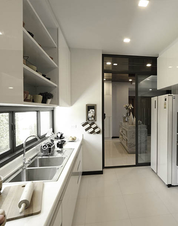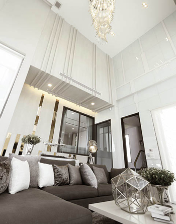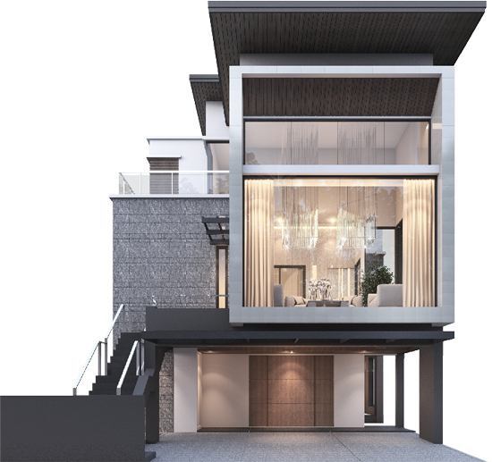 THREE-STORY LUXURIOUS RESIDENCE - บ้านเดี่ยว 3 ชั้น พื้นที่ใช้สอย 396 ตร.ม. 4 ห้องนอน 4 ห้องน้ำ ห้องรับแขก ห้องพักผ่อน ห้องรับแขกส่วนตัว ห้องสวดมนต์ ห้องครัว ห้องแม่บ้าน ห้องน้ำแม่บ้าน ที่จอดรถ 3 คัน ใช้กระจก TEMPERED ไม่มีเฟรม แบบ SHOWROOM มาเป็นหนึ่งในดีไซน์ ทำให้ไร้ขีดจำกัดทางสายตา หรูหรา สง่างาม โปร่งโล่งเป็นพิเศษ ด้วยระดับเพดานที่สูงมากกว่า 6 เมตร พร้อมบันไดทางเชื่อมพิเศษสำหรับแขกผู้มาเยือน จากหน้าบ้านโดยไม่ต้องผ่านเข้าตัวบ้าน เพิ่มความเป็นส่วนตัวมากยิ่งขึ้น