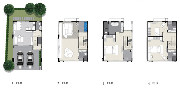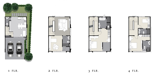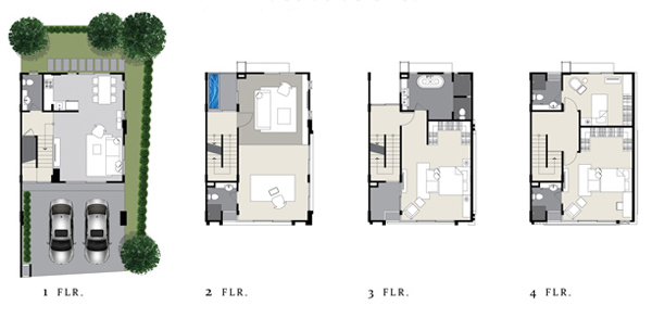 3. แบบ Denfert Villa - ทาวน์โฮม 4 ชั้น หน้ากว้าง 5.5 เมตร พื้นที่ใช้สอย 225 ตร.ม. ขนาด 3 ห้องนอน 5 ห้องน้ำ 1 ห้องรับแขก 1 ห้องนั่งเล่น 1 ห้องอเนกประสงค์ 1 ห้องครัว 1 ห้องรับประทานอาหาร ที่จอดรถ 2 คัน