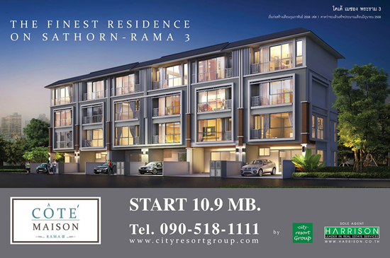 บริษัท ซิตี้รีสอร์ท ลิฟวิ่งโฮม จำกัด ได้เปิดตัวทาวน์โฮมโครงการใหม่ "โคเต้ เมซอง พระราม 3 (Cote Maison Rama 3)" ให้ทุกท่านได้เป็นเจ้าของทำเลที่ดีที่สุดย่านพระราม 3 กับพรีเมียมทาวน์โฮมที่โดดเด่นด้วยสถาปัตยกรรมร่วมสมัย Post Modern Contemporary พร้อม Functional Living ลงตัวกับการใช้งาน ความสะดวกสบาย และความเป็นส่วนตัว ภายใต้สังคมคุณภาพที่ถูกเนรมิตให้มีความเป็นส่วนตัวจำนวน 79 ยูนิต บนพื้นที่ทั้งหมดจำนวน 8 ไร่ 1 งาน 6 ตารางวา ลักษณะโครงการเป็นทาวน์โฮม 4 ชั้น มีแบบบ้าน 4 แบบ พื้นที่ใช้สอยตั้งแต่ 225-295 ตร.ม. แวดล้อมด้วยสิ่งอำนวยความสะดวกอย่างครบครันทั้งคลับเฮ้าส์ สระว่ายน้ำขนาดใหญ่ ฟิตเนส และสวนหย่อม มั่นใจกับการดูแลด้วยระบบรักษาความปลอดภัยพร้อม CCTV ตลอด 24 ชั่วโมง