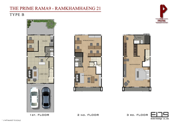 2. Type B - Home Office ทาวน์โฮม 3 ชั้น หน้ากว้าง 4.25 - 5 เมตร พื้นที่ใช้สอย 127.50 - 150 ตารางเมตร ดีไซน์ Modern Tropical จอดรถได้ 2 คัน