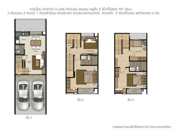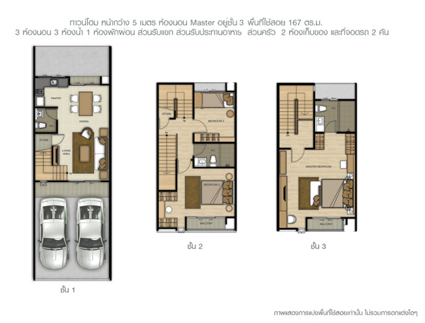 2. แบบบ้าน Type B, BB - ทาวน์โฮม 3 ชั้น หน้ากว้าง 5 เมตร 3 ห้องนอน 3 ห้องน้ำ 1 ห้องพักผ่อน ส่วนรับแขก ส่วนรับประทานอาหาร ส่วนครัว 2 ห้องเก็บของ ที่จอดรถ 2 คัน พื้นที่ใช้สอยประมาณ 167 ตร.ม.