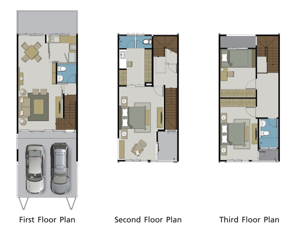 แบบบ้าน TH3 - ทาวน์โฮม 3 ชั้น หน้ากว้าง 5 เมตร ขนาด 3 ห้องนอน 3 ห้องน้ำ และที่จอดรถ 2 คัน พื้นที่ใช้สอย 182 ตารางเมตร ที่ดินเริ่มต้น 19.38 ตารางวา