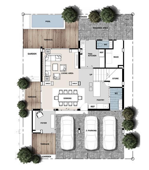 1. แบบบ้าน MOTIVO - บ้านเดี่ยว 3 ชั้น ขนาด 5 ห้องนอน 6 ห้องน้ำ ห้องรับแขก ห้องนั่งเล่น ห้องครัวไทย ห้องเตรียมอาหาร ห้องทำงาน ห้องนอน ห้องน้ำแม่บ้าน จอดรถได้ 3 คัน