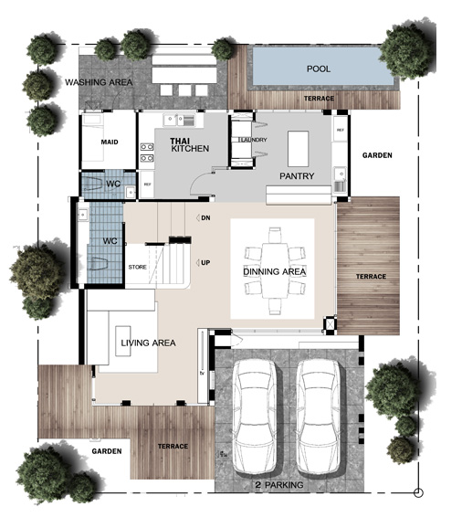 2. แบบบ้าน PREDO - บ้านเดี่ยว 2 ชั้น ขนาด 4 ห้องนอน 5 ห้องน้ำ ห้องรับแขก ห้องนั่งเล่น ห้องครัวไทย ห้องเตรียมอาหาร ห้องทำงาน ห้องนอน ห้องน้ำแม่บ้าน จอดรถได้ 2 คัน