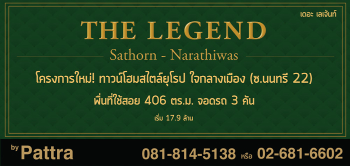 บริษัท ภัทราวิลล่า จำกัด ได้เปิดตัวทาวน์เฮ้าส์ ทาวน์โฮมโครงการใหม่ "เดอะ เลเจ้นท์ สาทร - นราธิวาส (The Legend Sathorn - Narathiwas)" ทาวน์โฮมสไตล์ยุโรปหลังใหญ่ ทำเลดีใจกลางเมือง พร้อมฟังก์ชั่นบ้านครบครัน ให้คุณได้สัมผัส ความสุขทุกพื้นที่ โครงการนี้มีลักษณะเป็นทาวน์โฮม 4 ชั้น พื้นที่โครงการ 3 ไร่ 19 ตารางวา มีแบบบ้าน 1 แบบ มีพื้นที่ใช้สอย 406 ตร.ม. 5 ห้องนอน 5 ห้องน้ำ 3 ที่จอดรถ ตั้งอยู่บนทำเลซอยนนทรี 22 ที่สามารถเข้า - ออกได้หลายทาง ไม่ว่าจะเป็นถนนพระราม 3 ถนนนราธิวาส หรือถนนรัชดาพระราม 3