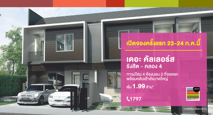 บริษัท อารียา พรอพเพอร์ตี้ จำกัด (มหาชน) ได้เปิดตัวทาวน์โฮมโครงการใหม่ "เดอะคัลเลอร์ส รังสิต - คลอง 4 (TheColors Rangsit - Klong 4)" ซึ่งเฟสแรกที่มีชื่อว่า "เดอะคัลเลอร์ส รังสิต - ลำลูกกา" ประสบความสำเร็จจนปิดการขายไปแล้ว โครงการนี้เป็นเฟสใหม่มีลักษณะเป็นทาวน์โฮมเหมือนเดิม สไตล์โมเดิร์นทรอปิคอล 2 ชั้น 4 ห้องนอน 2 ที่จอดรถ กับแนวคิดให้คุณใช้ชีวิตที่เต็มไปด้วย "สีสัน" ในสังคมคุณภาพ ที่ เดอะคัลเลอร์ส กับพื้นที่ใช้ชีวิตขนาด 118 ตร.ม. พร้อมคลับเฮ้าส์ขนาดใหญ่และสวนสีเขียวรอบโครงการ เดินทางสะดวกเพียง 10 นาที จากวงแหวนกาญจนาภิเษกฯ นอกจากนี้ยังใกล้สถานีรถไฟฟ้าสายสีเขียว หมอชิต-สะพานใหม่-คูคต และสถานีรถไฟฟ้าสายสีแดง สถานีบางซื่อ-รังสิต