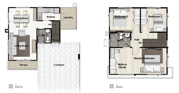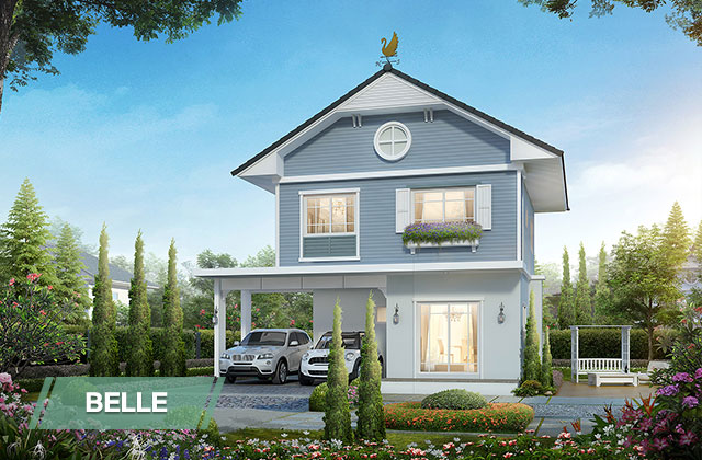 3. Belle - บ้านเดี่ยว 2 ชั้น พื้นที่ใช้สอย 106 ตร.ม. 3 ห้องนอน, 2 ห้องน้ำ, 1ห้องนั่งเล่น, 1 ส่วนรับประทานอาหาร, 1 ห้องครัว, พร้อมที่จอดรถในร่ม 2 คัน