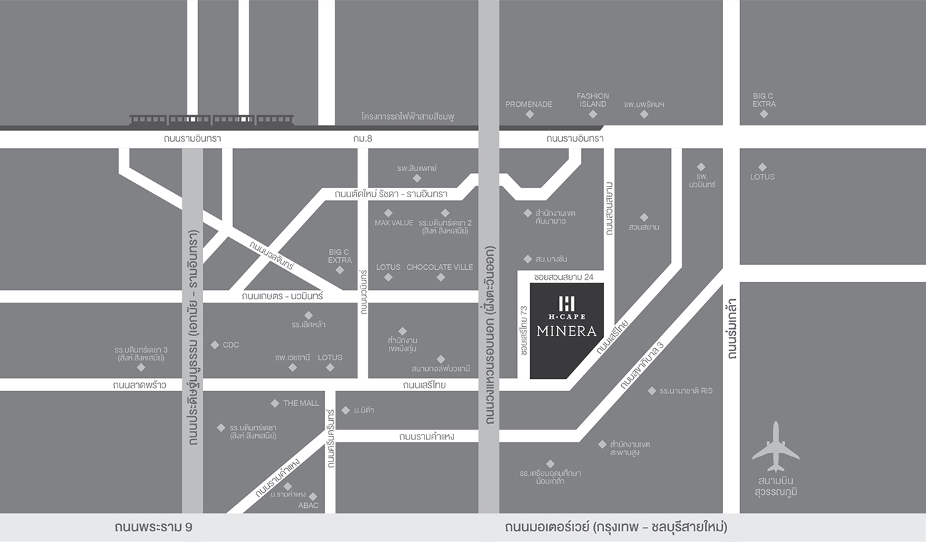 - LOCATION ที่ตั้งของไลฟ์ สไตล์เอชเคป มิเนอราซ่อนตัวอยู่ในใจกลางรามอินทรา บนถนนสวนสยามซึ่งเชื่อมต่อกับใจกลางเมืองกรุงเทพฯ และสถานที่สำคัญๆ