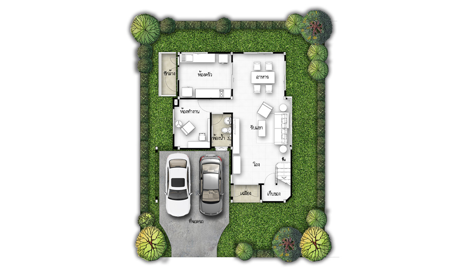 3. แบบบ้านศุภลักขณา - บ้านเดี่ยว 2 ชั้น พื้นที่ใช้สอย 150 ตร.ม. สร้างบนที่ดินตั้งแต่ 50 ตร.ว. ขึ้นไป ขนาด 3 ห้องนอน 3 ห้องน้ำ ที่จอดรถ 2 คัน กั้นส่วนครัวเป็นสัดส่วน
