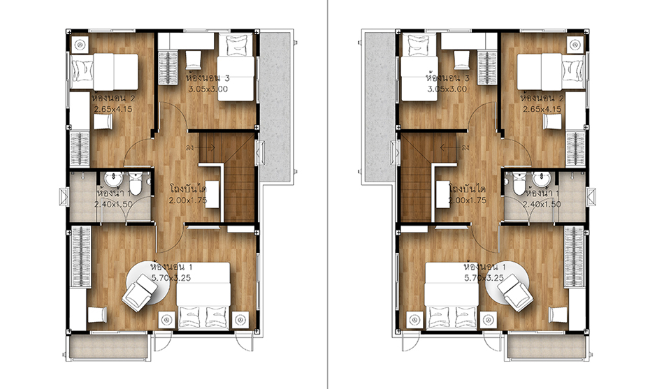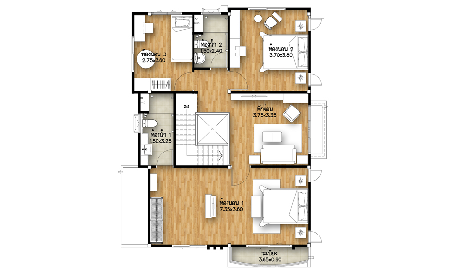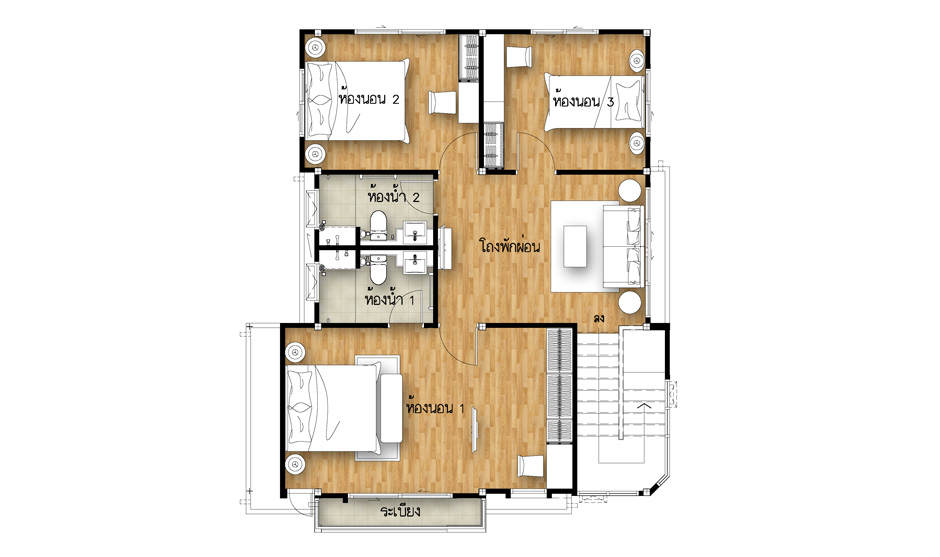 5. แบบบ้านศุภฤทธิ์ - บ้านเดี่ยว 2 ชั้น พื้นที่ใช้สอย 175 ตร.ม. สร้างบนที่ดินตั้งแต่ 50 ตร.ว. ขึ้นไป ขนาด 4 ห้องนอน 3 ห้องน้ำ 1 ส่วนพักผ่อน ที่จอดรถ 2 คัน