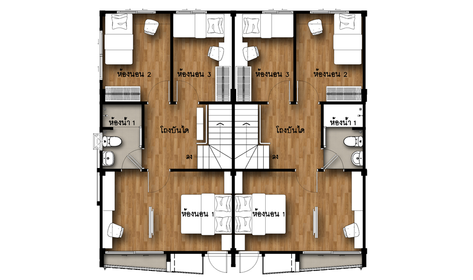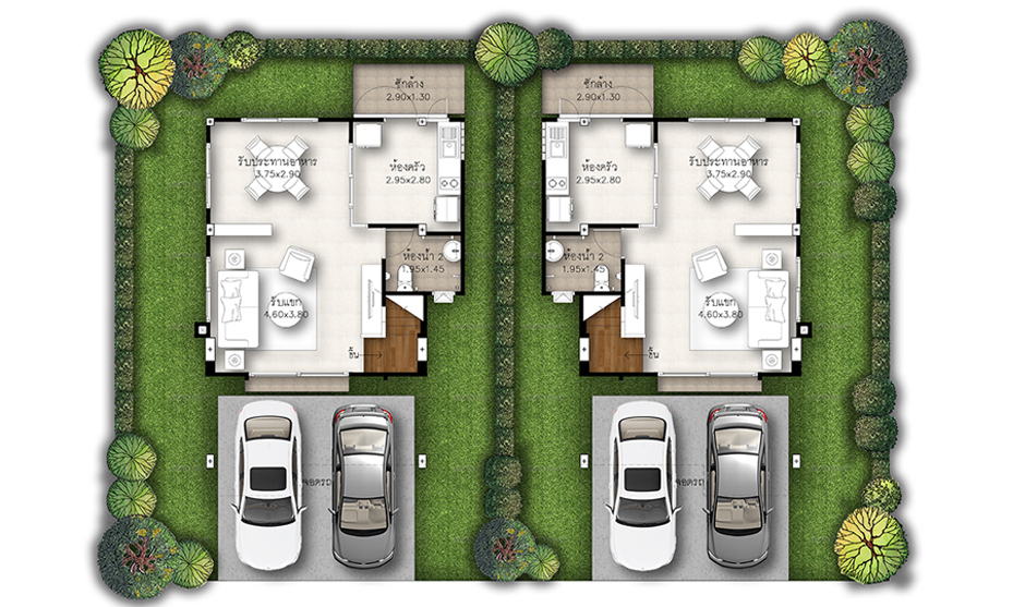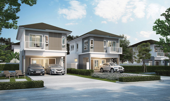 2. แบบบ้านศุภกัลยา - บ้านแฝด 2 ชั้น พื้นที่ใช้สอยเริ่ม 122 ตร.ม. ขนาดที่ดินเริ่มต้น 35 ตร.วา. ขนาด 3 ห้องนอน 2 ห้องน้ำ และที่จอดรถ 2 คัน